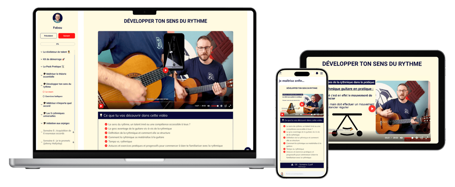 En revanche, si tu débutes totalement ou si tu veux être accompagné pas à pas avec une structure claire et progressive, le programme complet GUITARE EXPRESS est la solution la plus adaptée.