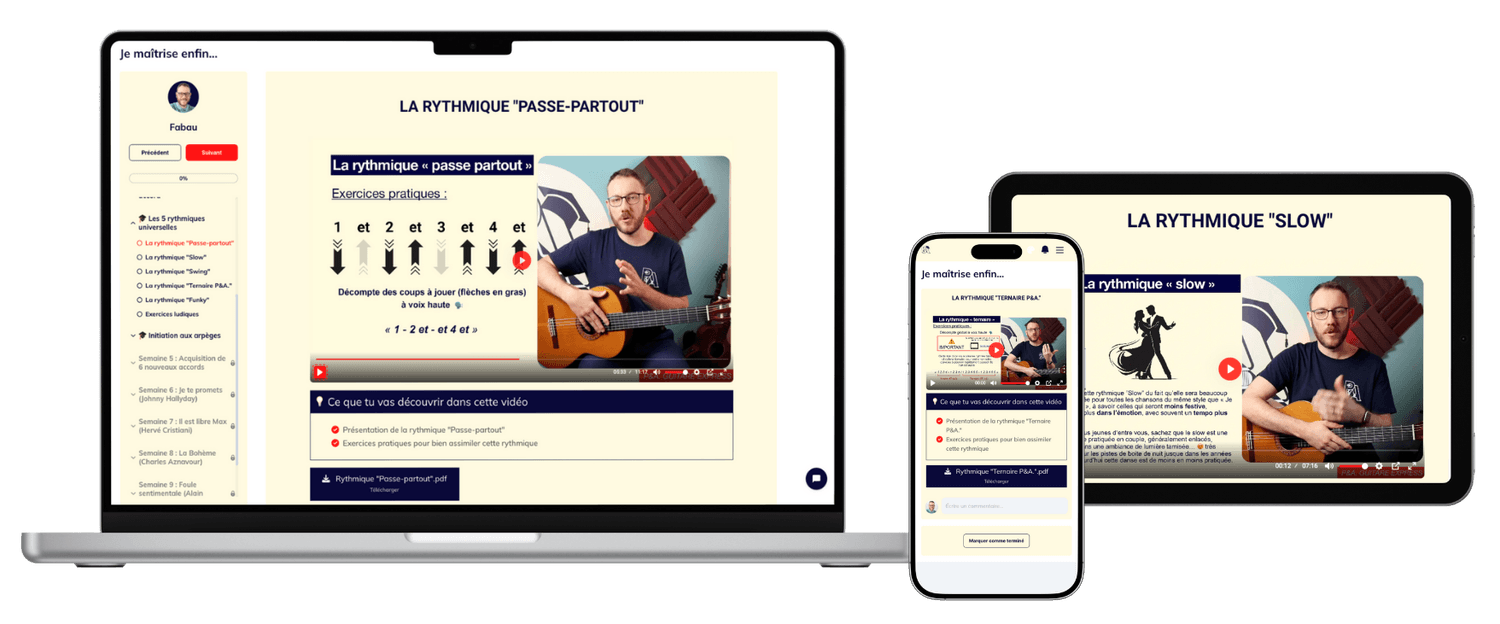 Actuellement j'ai juste suivi ton cours sur les 5 rythmiques et c'est juste une pépite, je galèrais trop pour trouver une rythmique adéquat sur certaines chansons... un blocage de moins désormais ! Et surtout ce qui m'a vraiment permis de progresser c'est les entrainements progressifs que tu nous fais faire pour chacune d'entre elles donc bravo pour ta pédagogie. Je vais prendre ton cours sur le sens du rythme aussi car j'en ai vraiment besoin je pense, ou alors directement le programme complet guitare express je verrai.